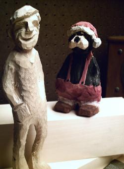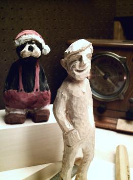 | Here are two more poses of what I got so far. He is pictured with my Black Bear Santa in red overalls, I carved this feller last weekend. So let me know what you think and check back for updates! |
