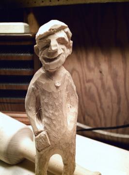 | First you start with a basswood block and trace a design and cut out with a bandsaw(or coping saws). With this one I found a pre-cut blank that already has Willies stature to it! Now the trick is to get the face right. This rough-out was cut intending to have a hat and beard. |